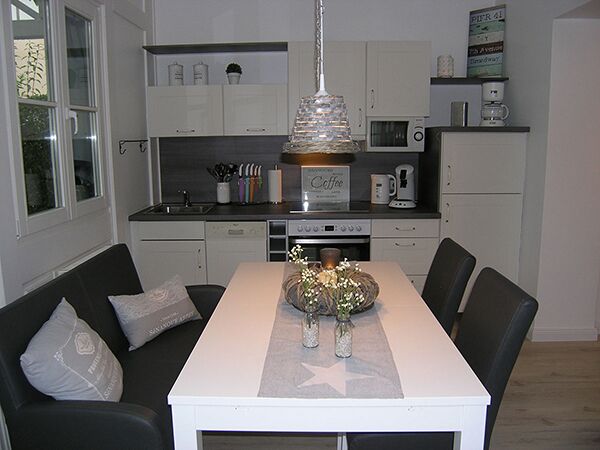 Die große Wohnküche ist in einer Veranda untergebracht. Die Küchenzeile im Landhausstil ist mit modernen Geräten ausgestattet. Ob Mikrowelle, Geschirrspüler, Ceranfeld, Backofen oder großer Kühlschrank; es ist einfach alles vorhanden. Sollte Ihnen einmal etwas fehlen, dann teilen Sie uns das mit. Wir freuen uns über Anregungen.