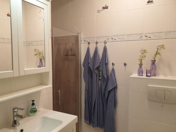 Hell und freundlich präsentiert sich das Duschbad. Es ist alles vorhanden und auch genug Platz zum Abstellen und Ablegen.